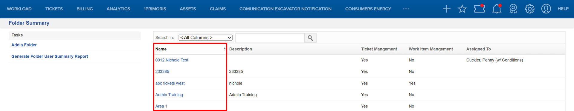 On the Folder Summary screen, select the folder name in the Name column (or use search/sort to find it).