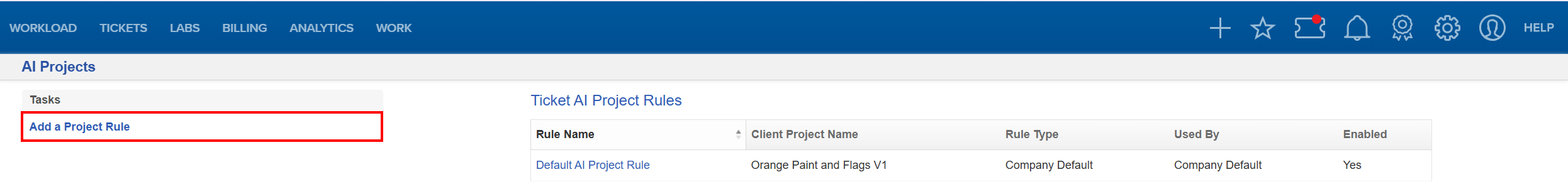 - Non-Ticket AI Projects: AI Projects created for non-ticket forms will appear in the list, but cannot have rules configured. These projects automatically use the global default.